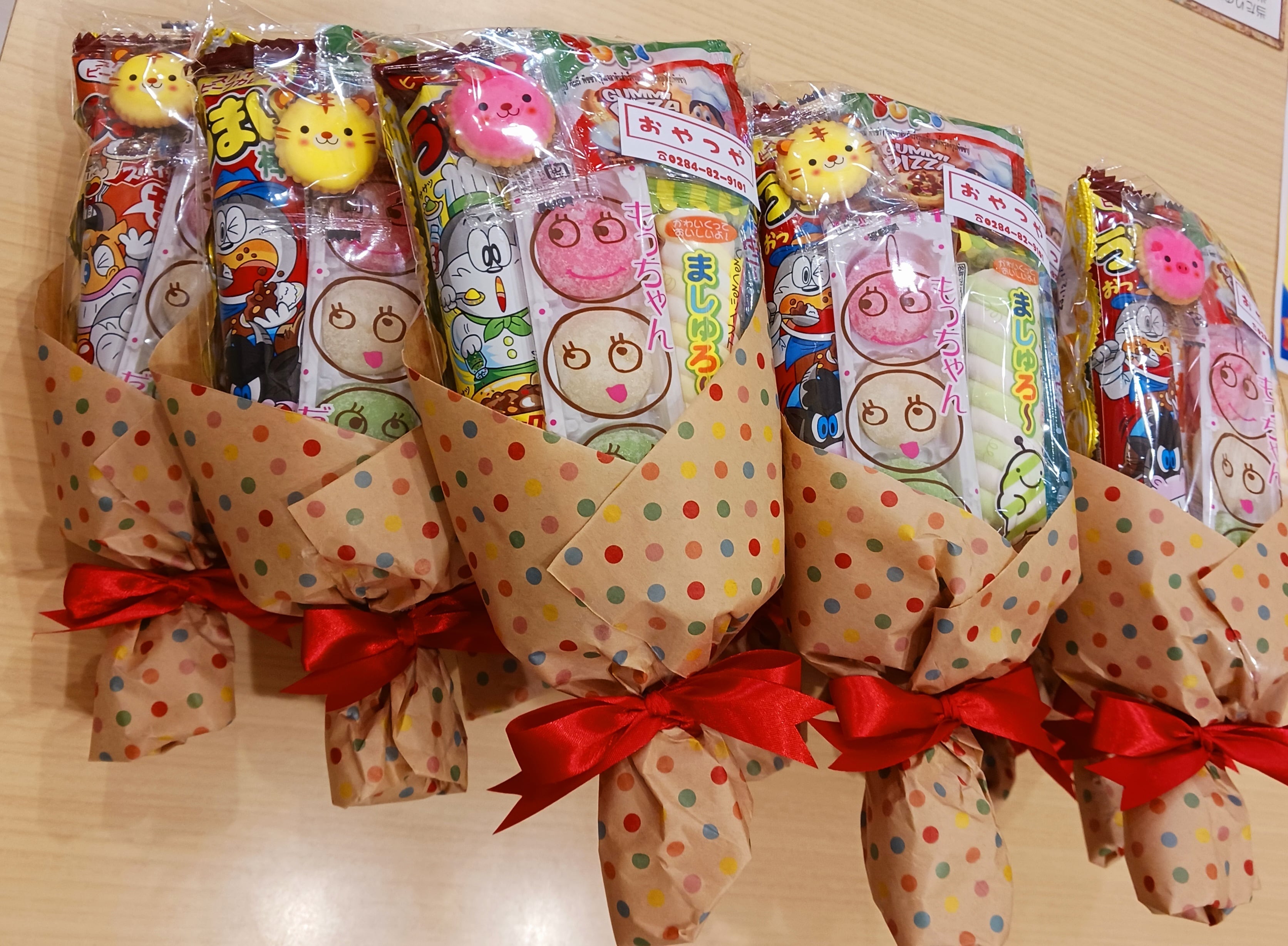 ◎ミニブーケの駄菓子の詰め合わせになります。中身の商品は画像とは異なります。ご希望の商品がありましたらご相談ください。ラッピングやリボンの色はご希望に応じます。